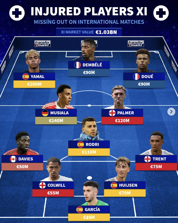 虎扑10月09日讯德转公布了因伤病错过本次国家队比赛日身价最高的十一人。西班牙的亚马尔以2亿欧身价领衔阵容: